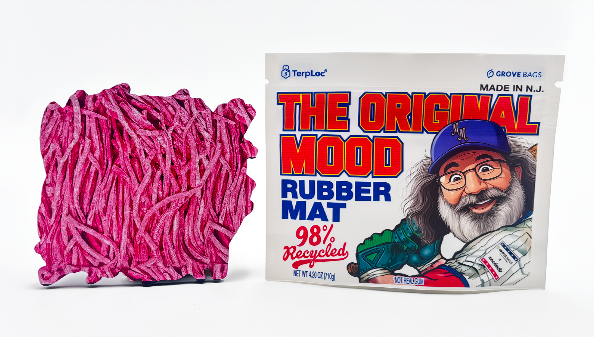 Grove Bags has partnered with Mood Mats to create the ultimate collectible accessory package, which debuted exclusively at Terp Basel. This collaboration features a special edition, custom-designed Grove Bag inspired by classic nostalgic shredded chewing gum packaging