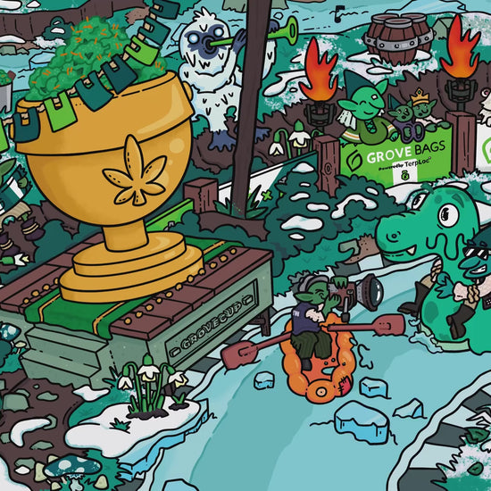 Cannabis connoisseurs and art enthusiasts are in for another treat. Cannabruv, the Netherlands-based artist and illustrator, partnered with Grove Bags once again on a new winter bag design. This time around, Cannabruv drew inspiration from F1 racing, monsters, and a touch of mystery, blending his unique and distinctive animation style with Grove Bags’ innovative approach to cannabis storage. The result? A bag that is as eye-catching and arresting as the plant inside of it.